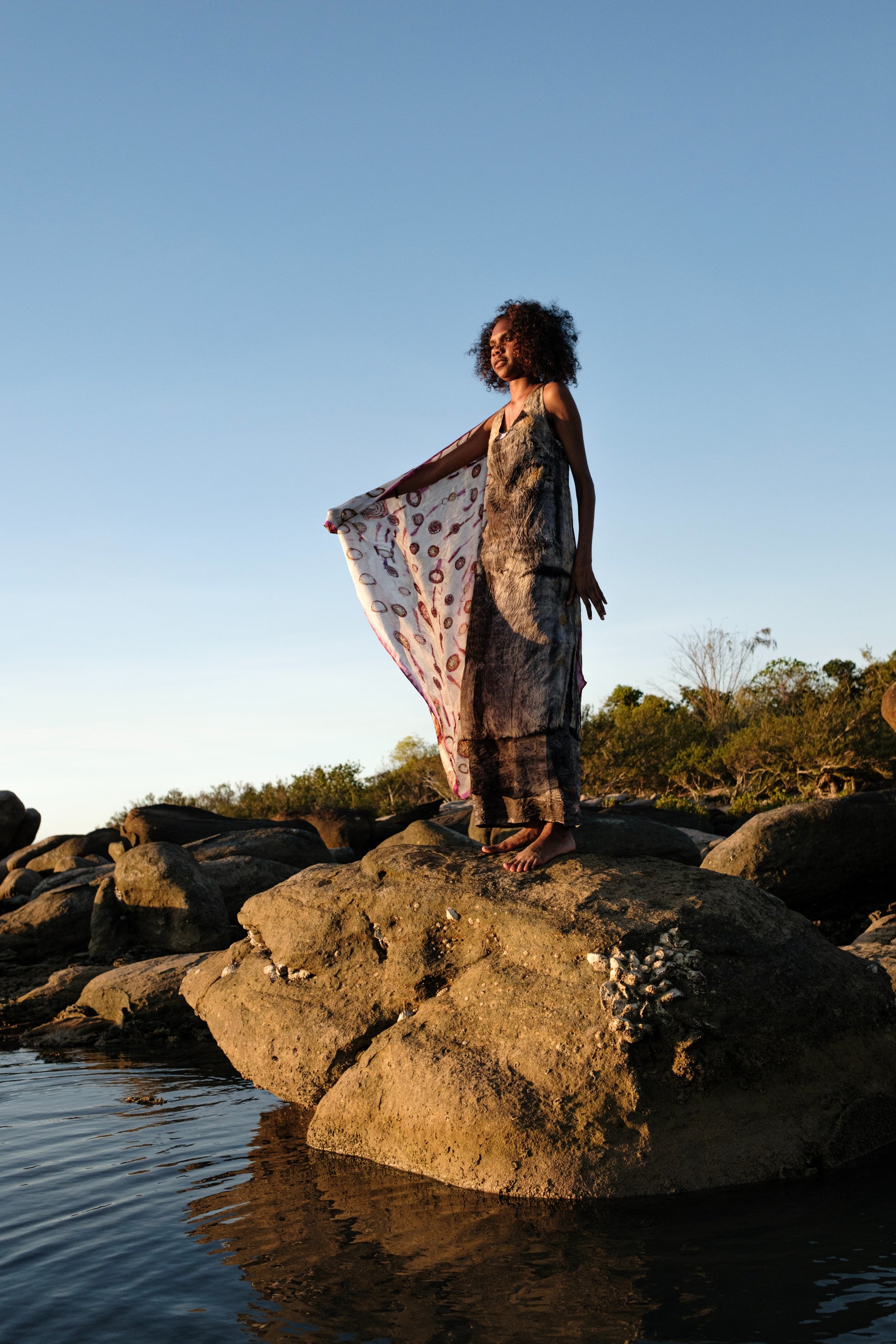 Through working with Darwin-based artist Anna Reynolds, the Warnindilyakwa artists have embraced digital design to create beautiful, one-of-a-kind textiles. They capture elements from their own artworks — inspired by their Country and Culture — and transform them using design software, resulting in original patterns that tell a story.
