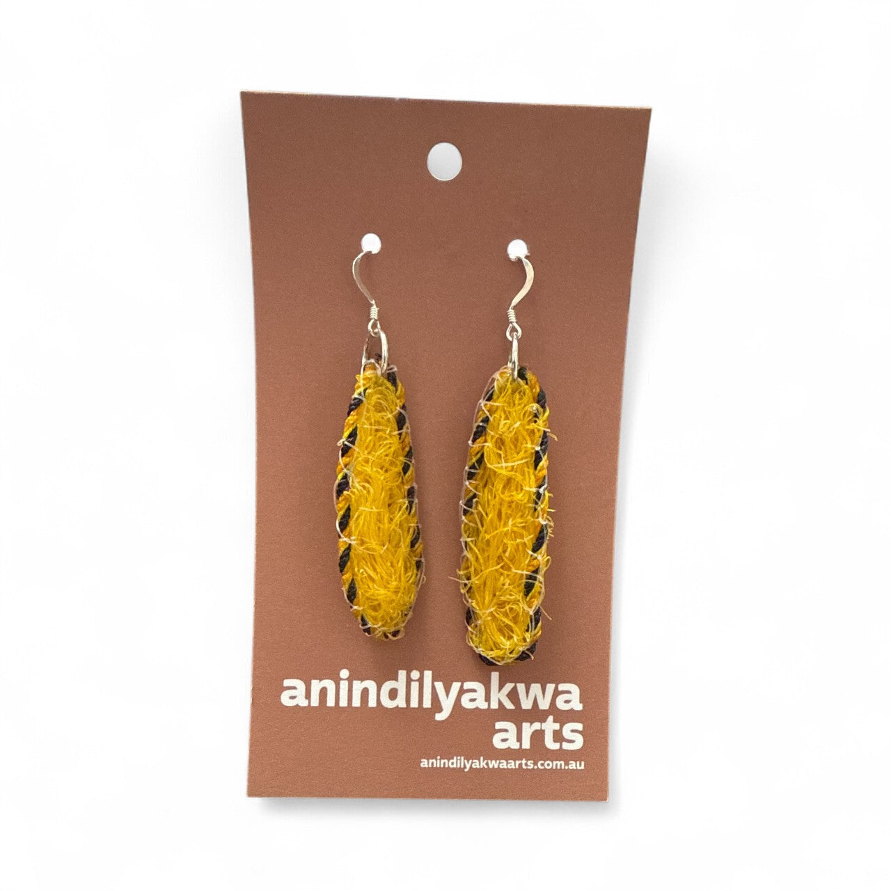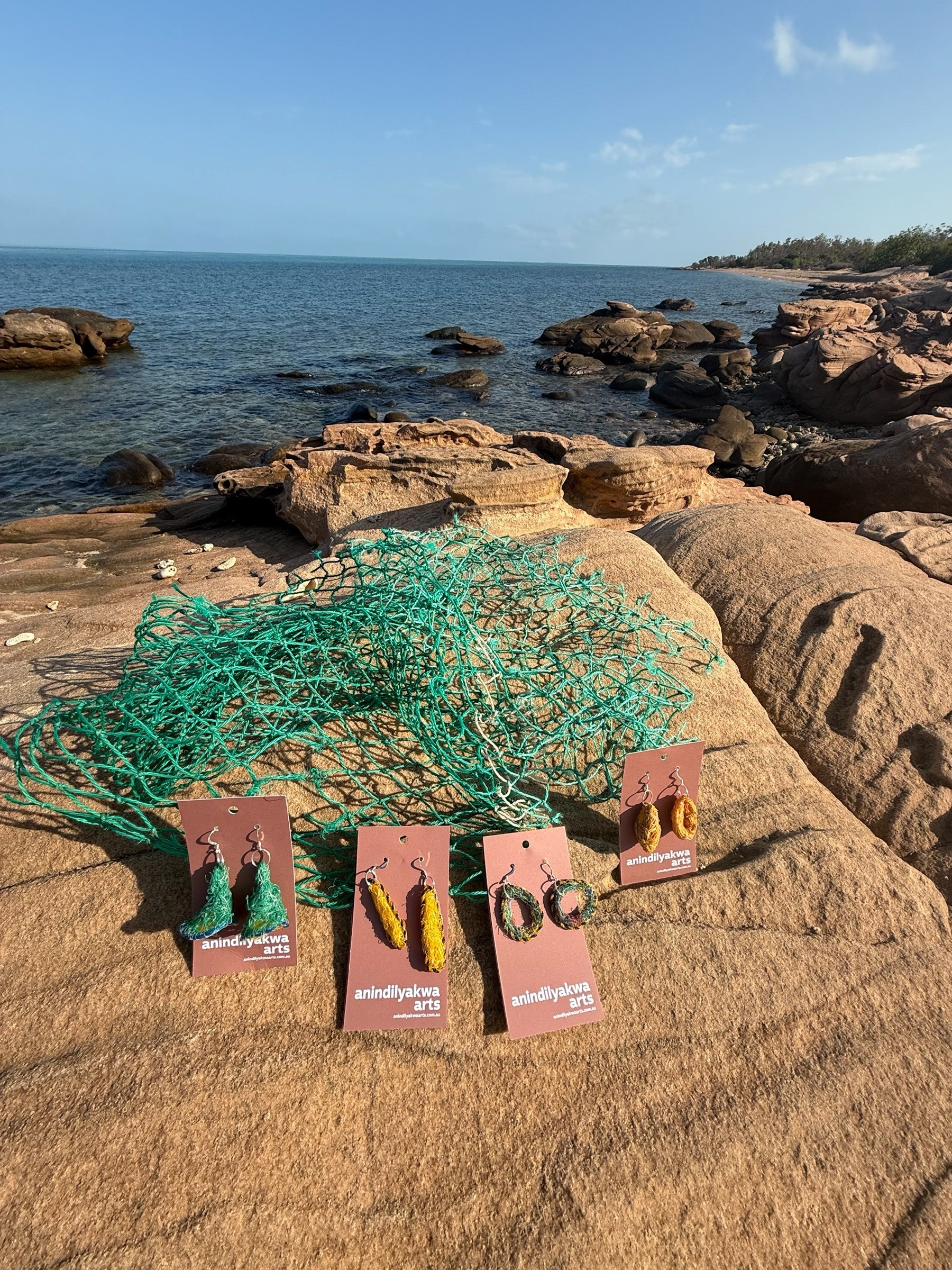 "When i was looking at the ghost net the idea of earrings came to my mind, the idea came to me and i wanted to try it. I wanted to make something new and to surprise the ladies at the art centre so they can see new ways and give them new ideas" Charmaine Kerindun
