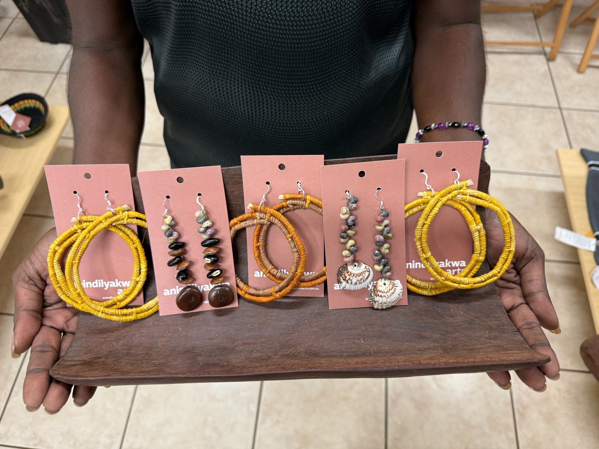 Sharna Wurrumara, an Arts and Cultural Officer and key artist of the Angurugu community, is best known for her weaving - particularly her 'Sharna Hoops', brightly woven hoop earrings that are a guaranteed sell out at every art fair.