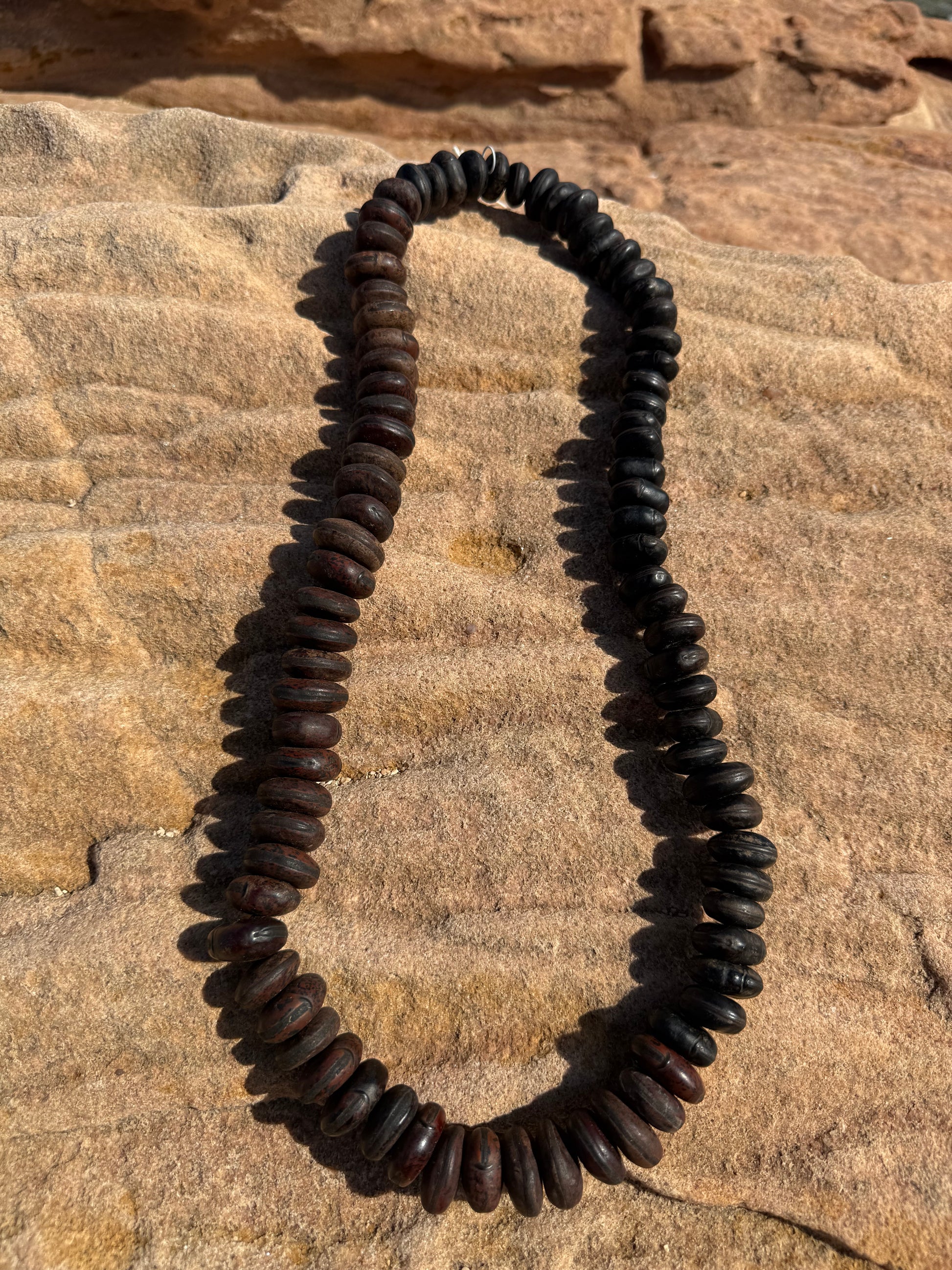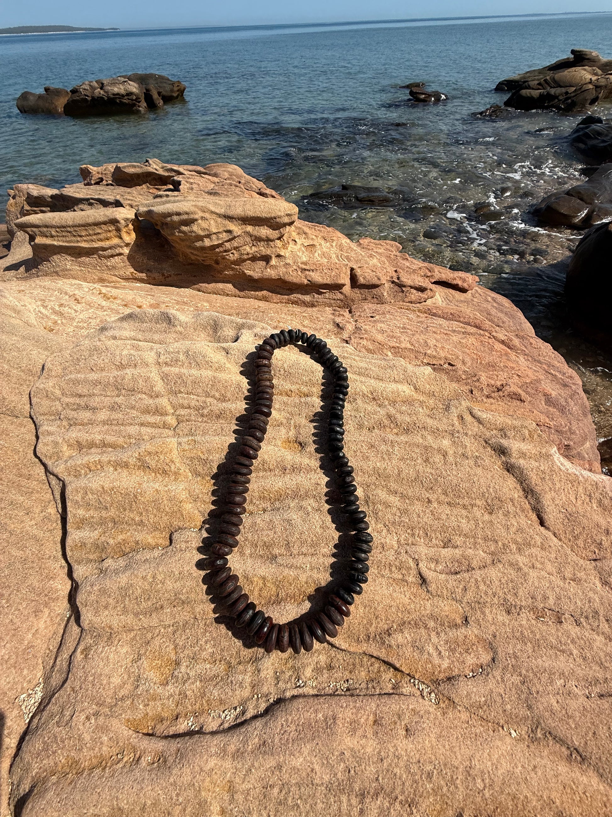 The little red beads often present in Anindilyakwa jewellery come from the Adenanthera Pavonina Tree, commonly known as the red bead tree. Thin brown seeds come from the Coffee Bean Seed. Gum nuts, shells, woven pandanus and various other nuts often adorn these handmade wares.
