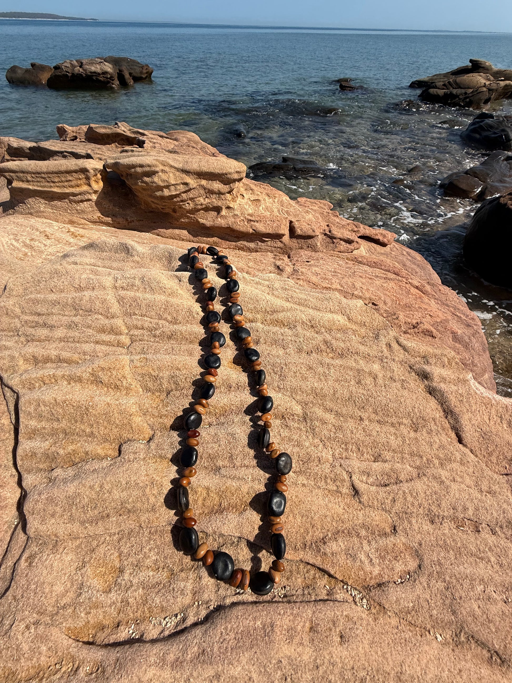 The little red beads often present in Anindilyakwa jewellery come from the Adenanthera Pavonina Tree, commonly known as the red bead tree. Thin brown seeds come from the Coffee Bean Seed. Gum nuts, shells, woven pandanus and various other nuts often adorn these handmade wares.