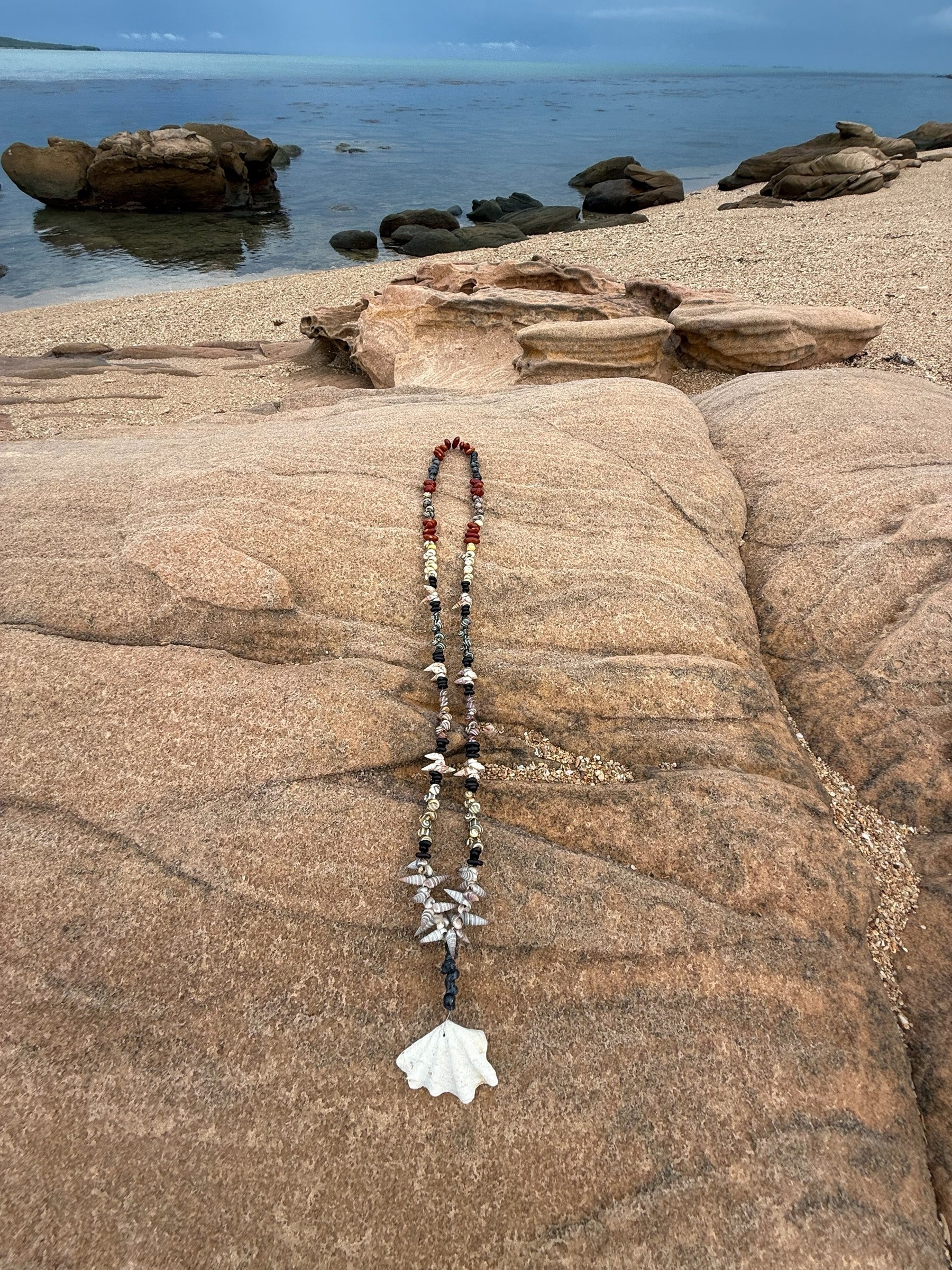 The little red beads often present in Anindilyakwa jewellery come from the Adenanthera Pavonina Tree, commonly known as the red bead tree. Thin brown seeds come from the Coffee Bean Seed. Gum nuts, shells, woven pandanus and various other nuts often adorn these handmade wares.